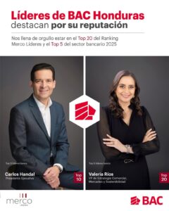 Asimismo, la institución se llena de orgullo al ver que sus ejecutivos destacan entre los líderes con mejor reputación en Honduras, Carlos Handal, Presidente Ejecutivo, se encuentra entre en el Top 10, y Valeria Ríos, Vicepresidente de Estrategia Comercial, Mercadeo y Sostenibilidad de BAC, en el Top 20 del ranking. Reflejando una gestión centrada en el talento, la ética y la cultura organizacional como pilares clave para fortalecer la confianza y generar valor sostenible.